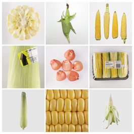 SOUTH AFRICA. 2015. GMO maize how it is found in the shops. The middle photograph is of six GMO seeds before planting. The pink color comes from a protective herbicide covering that helps the seed develop into a plant.