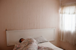 Prostitute waking up in a brothel room.