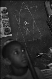 ETHIOPIA. Gondar. A Jewish family which, having abandonned its good village life, is still hoping to emigrate to Israel. They are called Falash Mura. Grandson, who wears the kippa, in his grandmother's mud-drried hut. A Star of David is chalked on the wall.