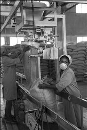ETHIOPIA. Addis Ababa. Processing plant of the Oromia Coffee Farmers' Cooperative Union. Coffee beans are put in bags.