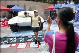 HONG KONG. June 2014. For the 25th anniversary of Tiananmen massacre June, 4th, 1989, students have put a fake tank and a copy of the Statue of Democracy in Causaway bay. Some people, including from Mainland China, are posing stupidly in front of them, apparently ignoring what happened. Others are caught by emotion.