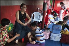 MYANMAR. Yangon. Nat kaddaw ( =nat wife=shaman) YANGON WIN NAING has her legs massaged before leading a ritual, asking for blessing from Nats (spirits). The shamans are all males who dress as women.