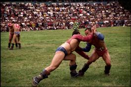 Nadym festival. Traditional wrestlers compete in the stadium.