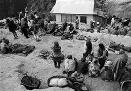 Nepal. Namche Bazar. Porters gather at dawn. Everest base camp...