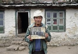 Nepal. Namche Bazar. Sherpa with photograph of a state visit...