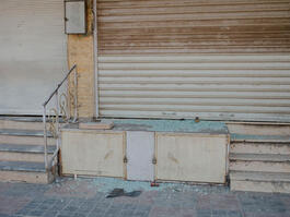 SYRIA. Sahnaya. 02 May 2025. Closed shops and splintered glass...