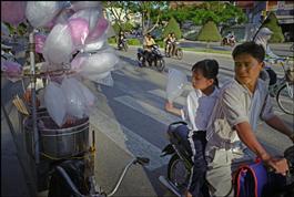 Vietnam. My Tho. A young girl riding pillion on a motor cycle...
