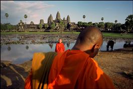 Cambodia. Angkor. Buddhist monks stroll beside the lake in...