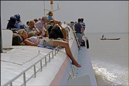Cambodia. Tonle Sap Lake. Tourists sunbathe on top of the boat...