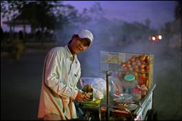 Vietnam. Can Tho. A smiling young man with his food cart cooking...