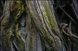 Cambodia. Angkor. A statue peeps between the roots of a banyan...