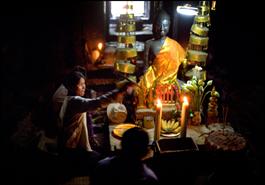Cambodia. Angkor. A nun tends a Buddhist shrine in the temple...