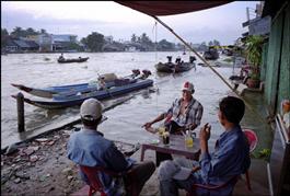 Vietnam. Can Tho. A fishing village clings to the water's edge...