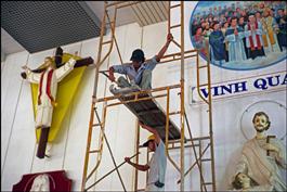 Vietnam. Chau Doc. Workmen paint the Catholic church whose...