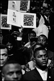 USA. 1966. Men at a Black Muslim meeting. Many hold up a book...