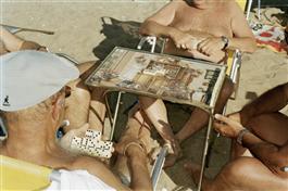 URUGUAY. Punta del Este. Reading and sunbathing on the beach....