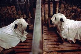 Argentina. Buenos Aires. Sheep with protective coats at the BAAF.1993....