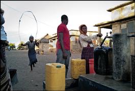 Africa. Mozambique. Namialo. A child fills his jerry cans...