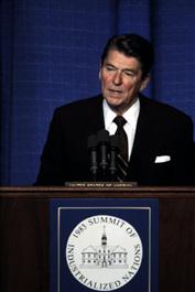 USA. Williamsburg, Virginia. 1983. President Ronald REAGAN delivers...