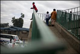 KENYA. 2014. Nairobi. Pedestrians on an overpass bridge overlooking...