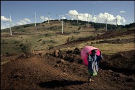 KENYA. 2014. Ngong Hills. A Masai girl walks by KenGen's wind...