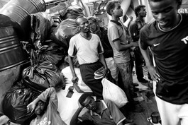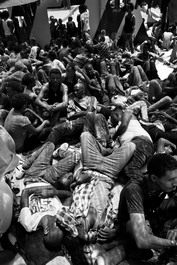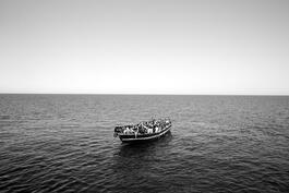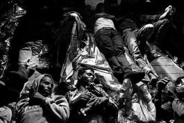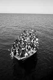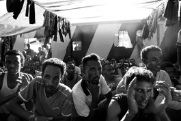 Mediterranean Sea. 2015. Eritrean migrants are seen in their...