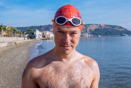 Turkey. Canakkale. 2018. British swimmers at the finish point...