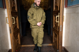 UKRAINE. Kyiv. 2018. Ukrainian soldier (or militia member) leaving...