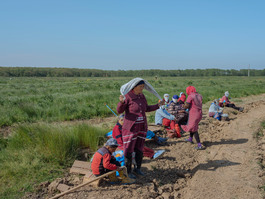 AZERBAIJAN, Lankaran. 2018. People work in a tea field in Osakuce...