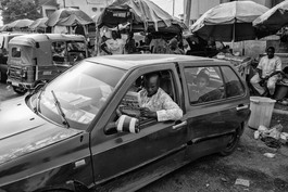 NIGERIA. Abuja. 2018. A man reads newspaper in Lagos street of...