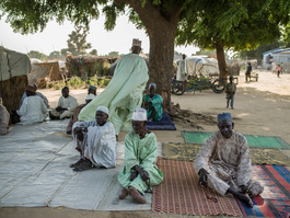 NIGERIA. Maiduguri. 2017. Men sit after prayer in the Muna camp...