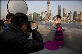 CHINA. Shanghai. A photographer takes photos of a young woman...