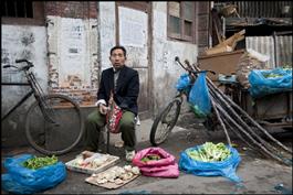 CHINA. Shanghai. March 2010. Vegetable vendor in the Old Shanghai....