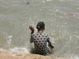 INDIA. Delhi. 2019. A woman bathes in the Yamuna river.