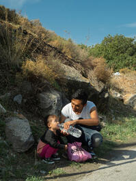 GREECE. Lesbos. 2019. A father and his child having a break after...