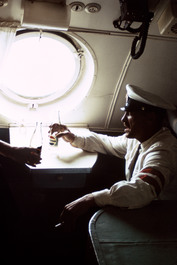 RUSSIA. 1974 . Mr. Lay talks to Mr. Warren on a hydrofoil boatride...
