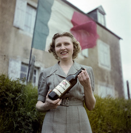 FRANCE. Normandy. 1947. Woman holding a bottle of Calvados.