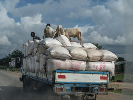 Ghana. Accra. 2016. Man and goats on truck. Road from Kintampo-Accra....