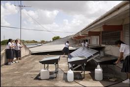 TRINIDAD. 2014. Students on the roof where they keep their solar...