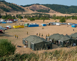 USA. Milo, Oregon. 2015. Firefighters camp for the Stouts Creek...