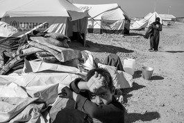 IRAQ. Baghdad. February 3, 2016. A young boy sits on a mattress...