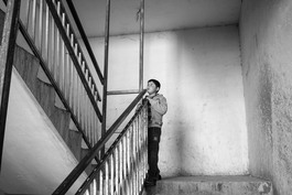 IRAQ. Baghdad. February 3, 2016. A young boy sits on a mattress...