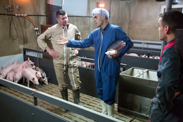 France. Brittany. Finistère. Lennon. Discussion between pig farmer...