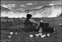TIBET. 2000. Old woman boiling tea at harvest-time.
