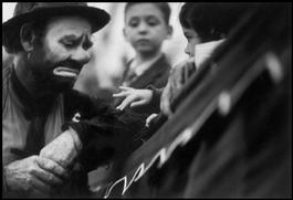 USA. New York. 1958. Clown frowning at young boy in the crowd,...