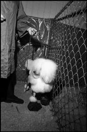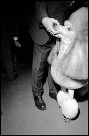USA. New York City. 2003. A handler holds a poodle's nose and...