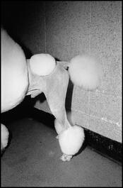 USA. New York City. 2003. Woman with poodle in the "make" area....
