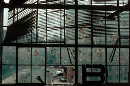 USA. New York City. 1983. A damaged window of a former dock building...