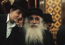 USA. New York City. 1983. Old man and boy in Lubavitcher Synagogue...