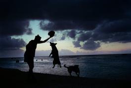 THE COOK ISLANDS. Rarotonga. Dogs on the beach under a full moon....